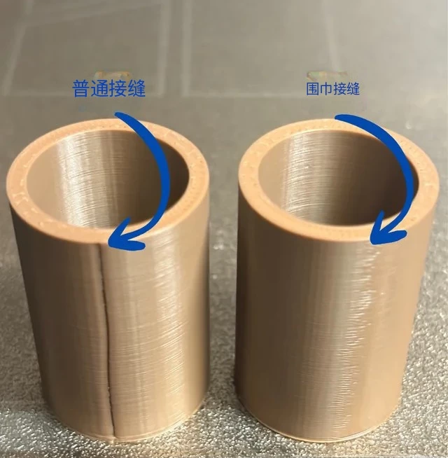第三个最重要的点——围巾缝在物理上是什么(图像 8)。首先我们先把“普通缝”定义为“层每个周边的起点和终点之间的一种间隙。它在模型表面留下垂直缝线, 在 FDM 打印中这是不可避免的 ……一些具有圆形表面的模型(例如圆柱体)将无法隐藏这些缝线”(来源:Bambu wiki)。