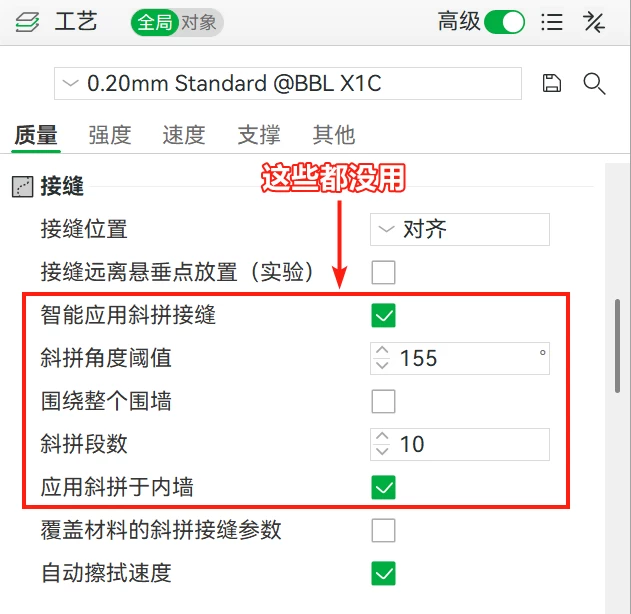 你也可以通过勾选“覆盖耗材斜接缝设置”来找到上面四个设置,但它们默认是隐藏的。