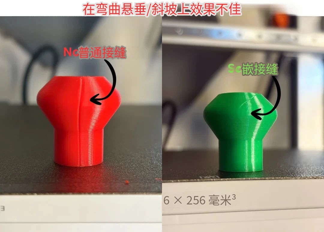 我用 0.6mm 喷嘴试了斜缝(scarf seam),并不小心把外壁也设成了 0.6mm,但仍然完全可行。多试试调整。
